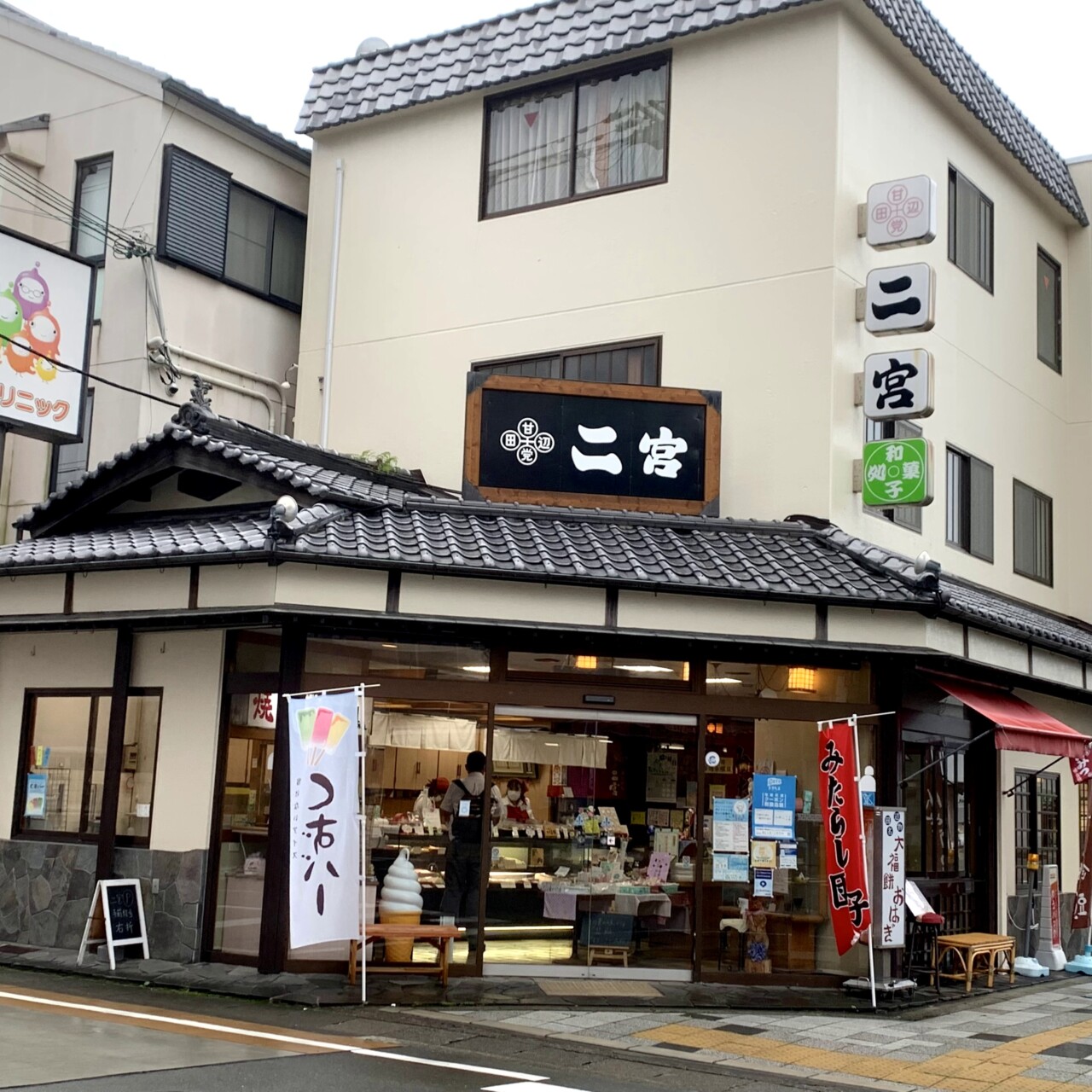 二宮さんは昭和8年の創業以来、世界遺産闘鶏神社の参道で変わらぬ味を守り続けながら絵営業しているお店です。おすすめの梅スイーツは「闘鶏まんじゅう(梅餡)」(税込160円)